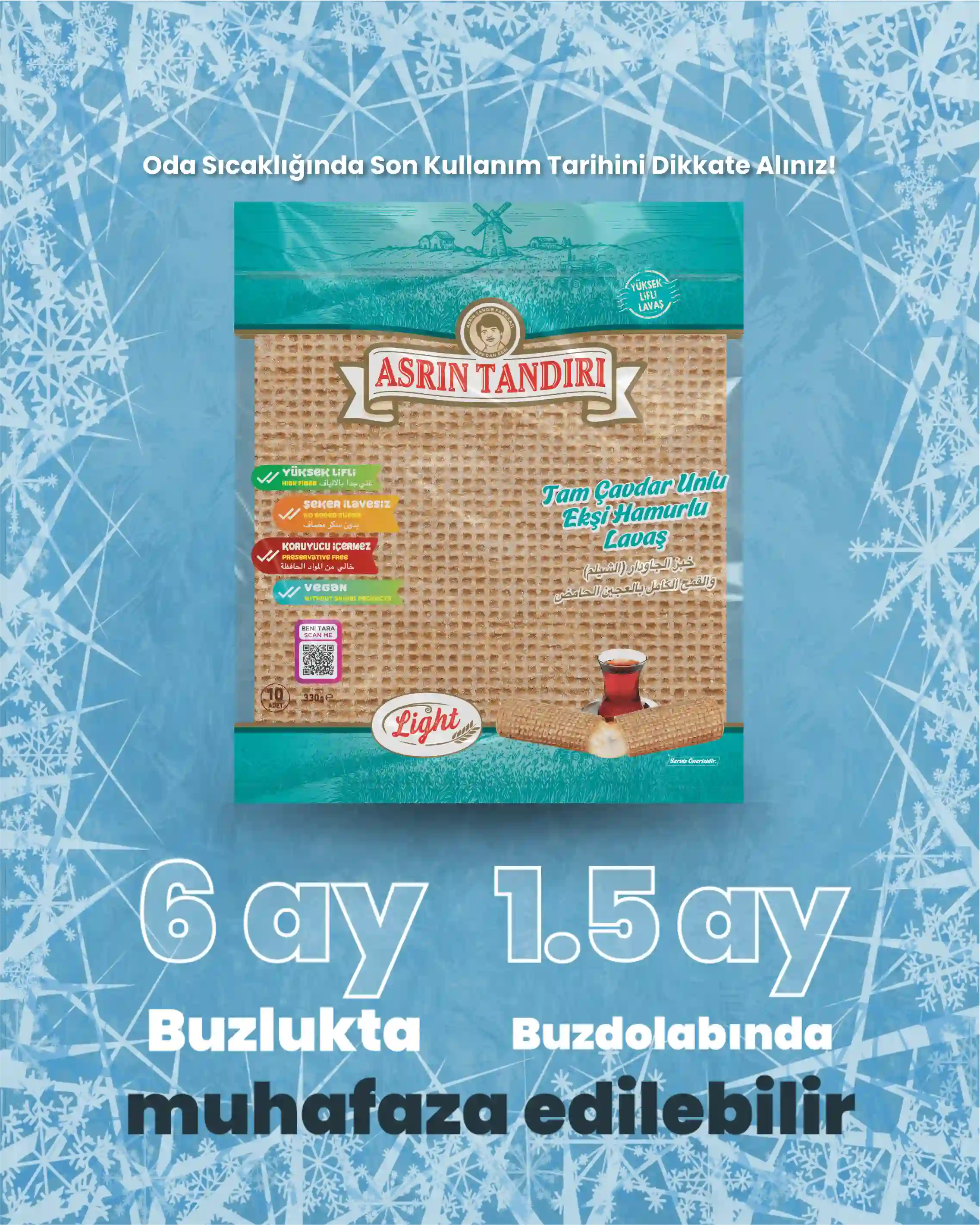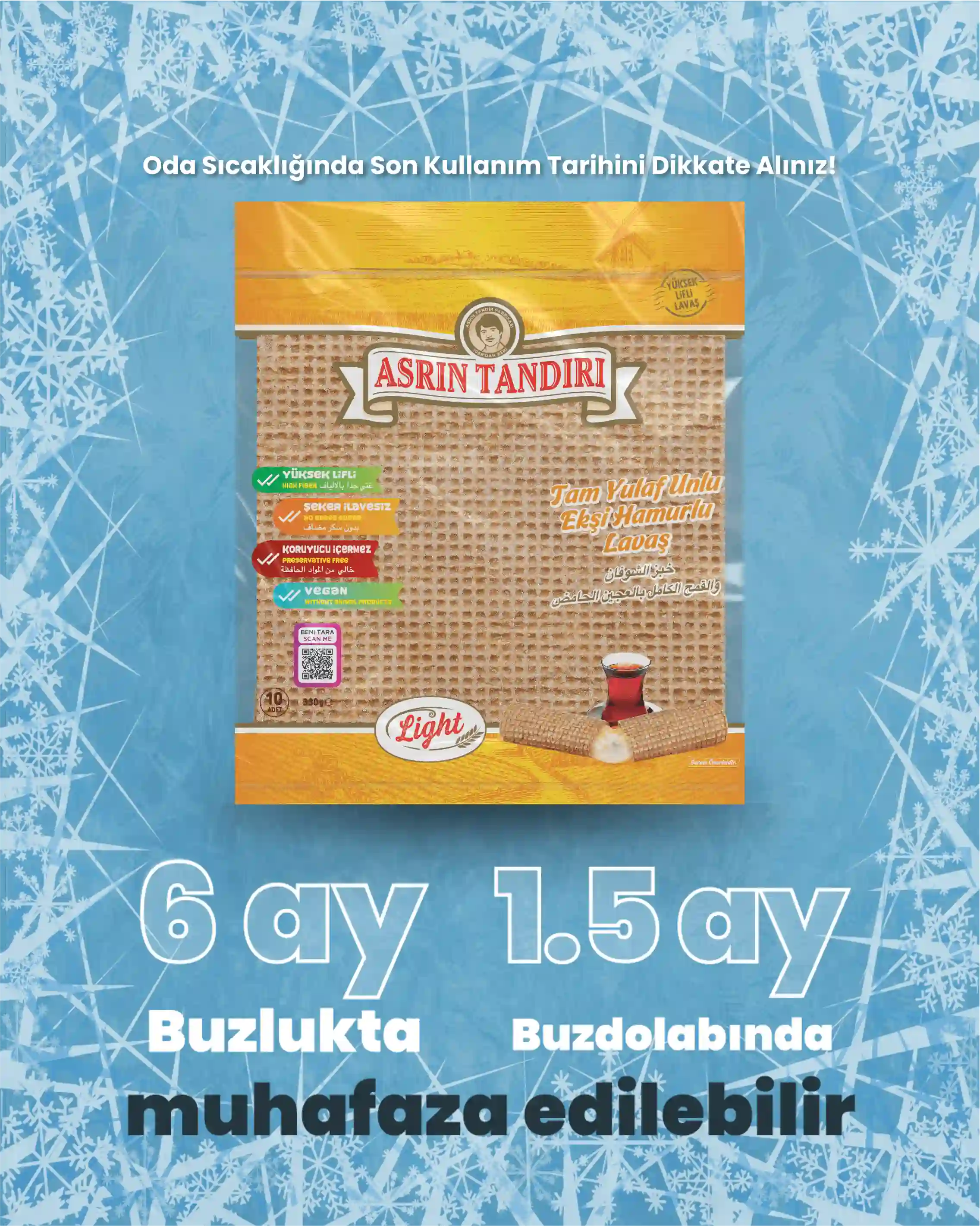 Asrın Tandırı ekmekleri, katkı ve koruyucu maddeler içermediğinden, ürünlerin son tüketim tarihleri oldukça kısadır. Bu nedenle, ekmeklerinizi uygun koşullarda saklamanız önemlidir. Ekmeklerinizi hava almayacak şekilde oda sıcaklığında 10 gün, buzdolabında 30 gün ve derin dondurucuda 45 güne kadar muhafaza edebilirsiniz. Dondurucuda sakladığınız ekmekleri tüketeceğiniz zaman, ihtiyacınız kadarını oda sıcaklığında çözdürerek ilk günkü tazeliğiyle tüketebilirsiniz