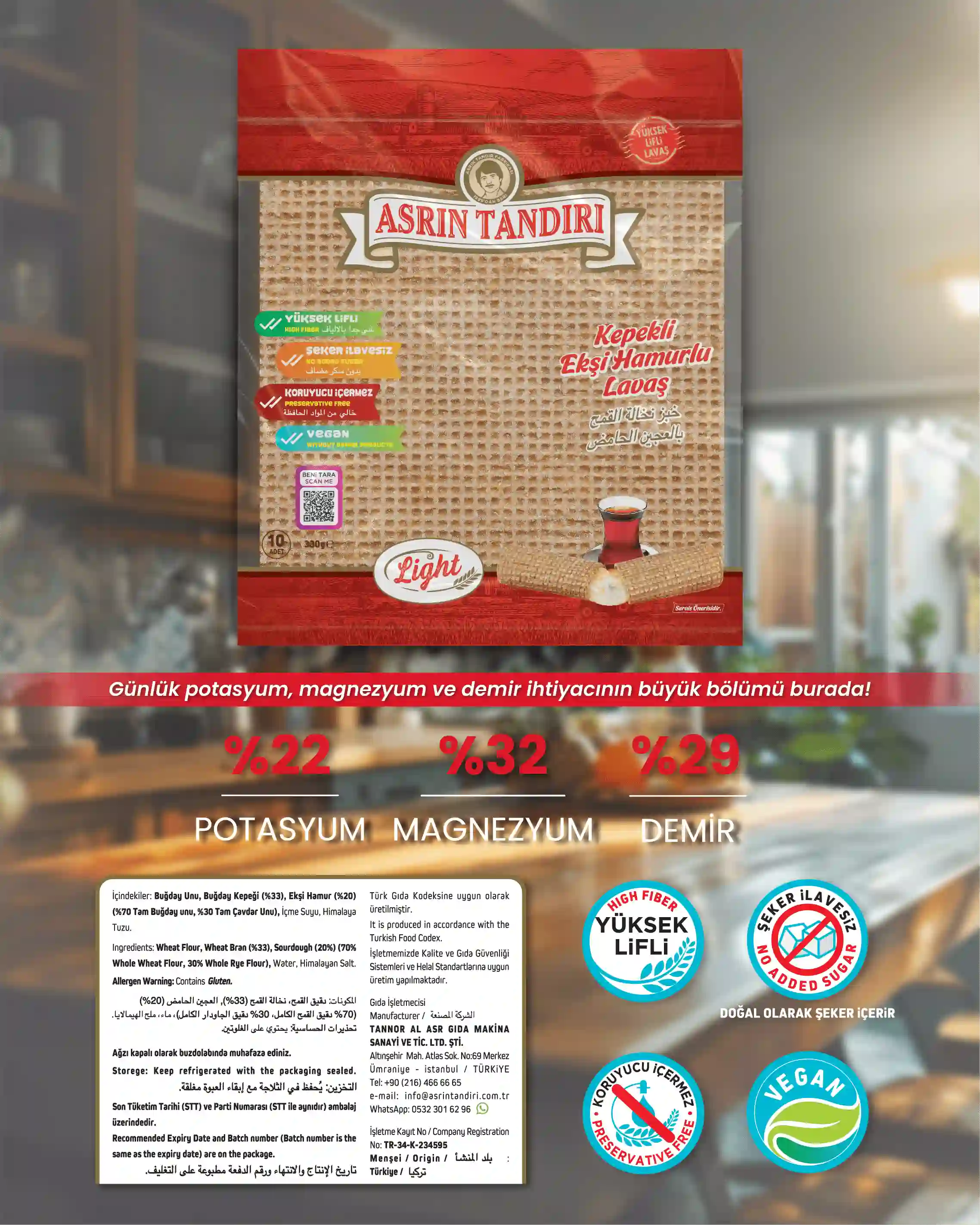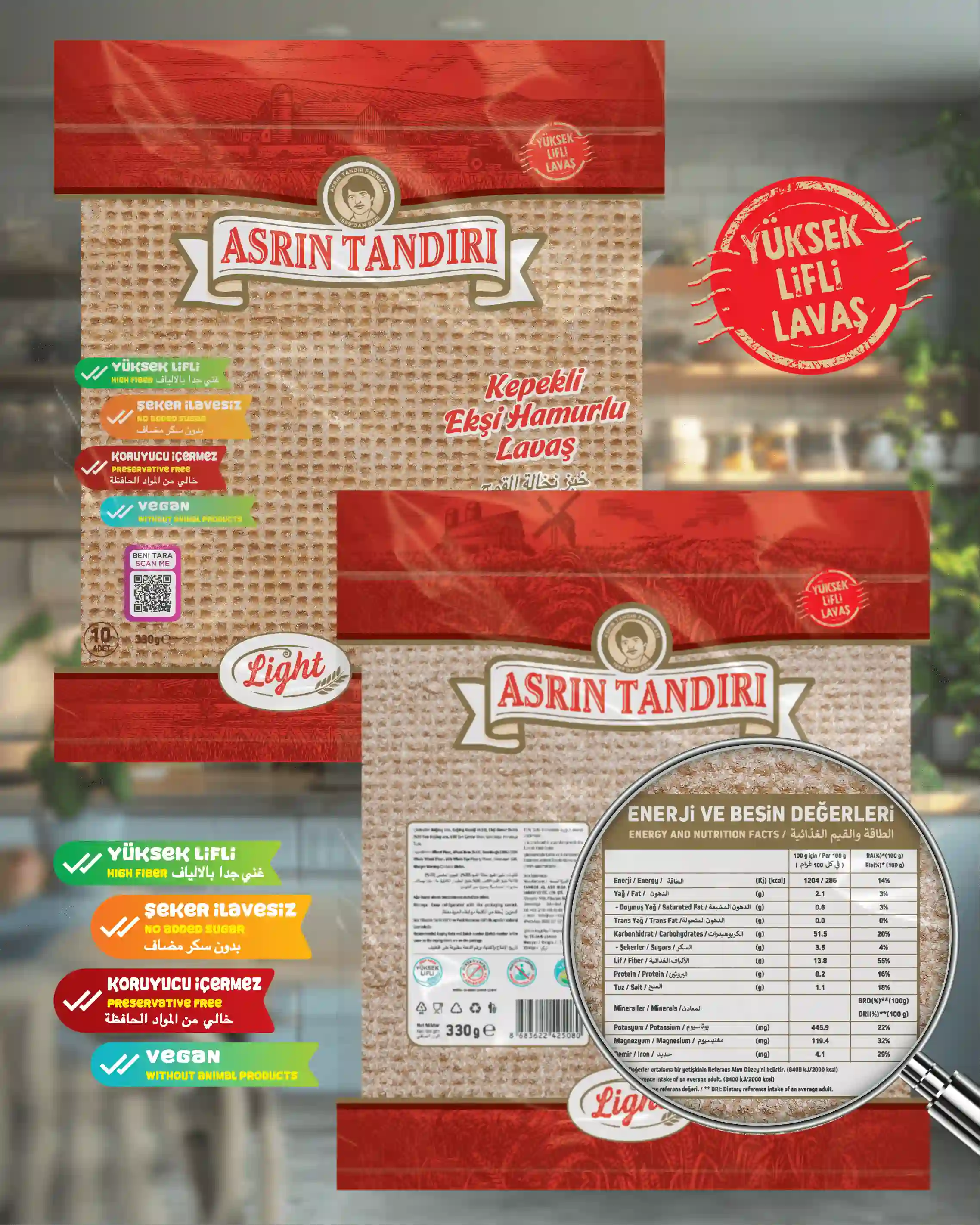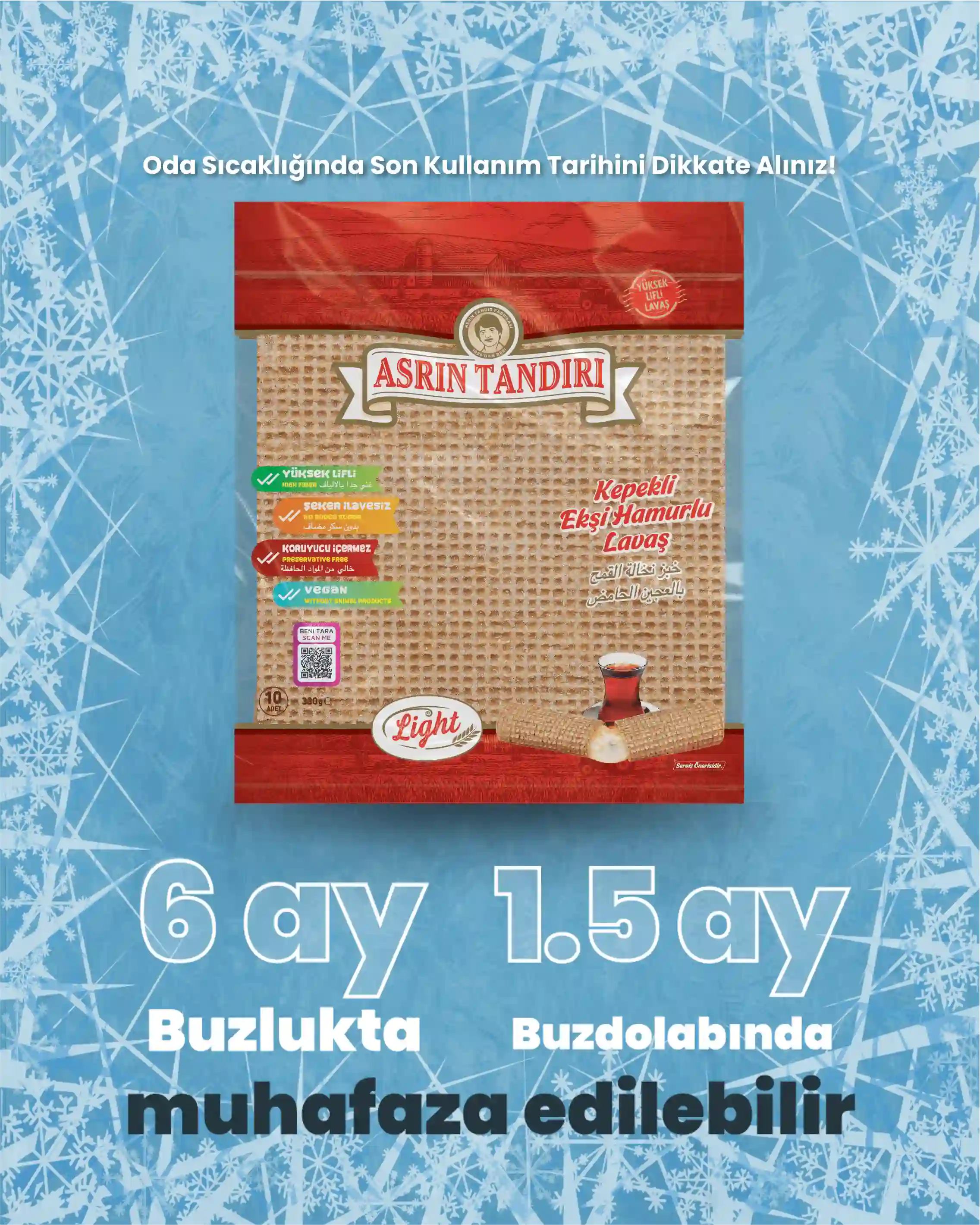 Asrın Tandırı ekmekleri, katkı ve koruyucu maddeler içermediğinden, ürünlerin son tüketim tarihleri oldukça kısadır. Bu nedenle, ekmeklerinizi uygun koşullarda saklamanız önemlidir. Ekmeklerinizi hava almayacak şekilde oda sıcaklığında 10 gün, buzdolabında 30 gün ve derin dondurucuda 45 güne kadar muhafaza edebilirsiniz. Dondurucuda sakladığınız ekmekleri tüketeceğiniz zaman, ihtiyacınız kadarını oda sıcaklığında çözdürerek ilk günkü tazeliğiyle tüketebilirsiniz